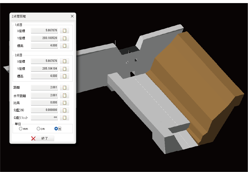 3Dモデルより、距離、座標値の確認ができます。また、計測結果はクリップボードに貼り付けて使用できます。