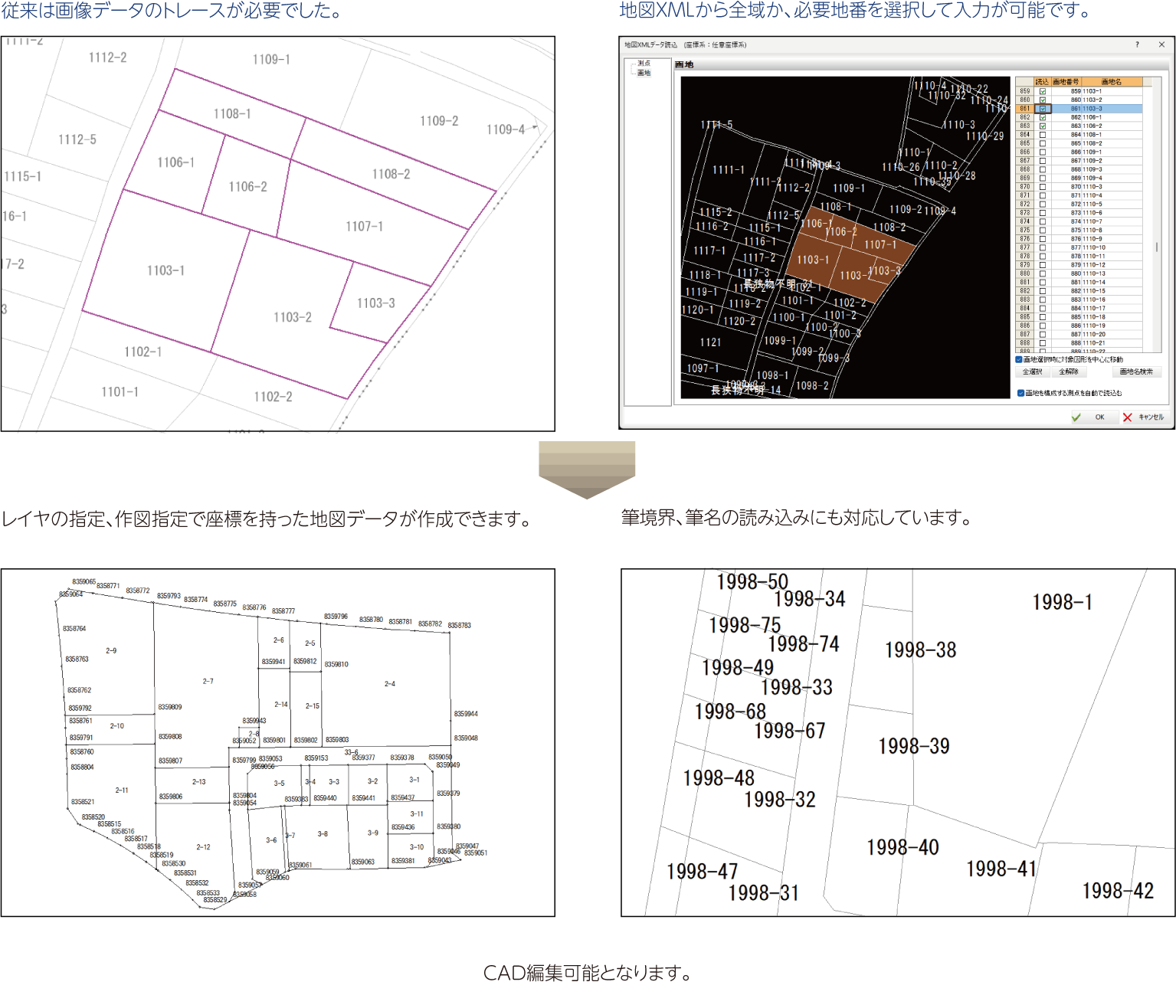 従来は画像データをCAD上でトレースする作業が必要でしたが、地図XMLをCADデータとして入力できる事により、作業が大幅に軽減されるようになります。また、複数の地図XMLを同時に読み込むことも可能です。
